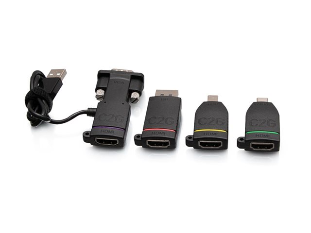 Produktbeskrivelse C2G Retractable Universal Mount 4K HDMI Adapter Ring with Color Coded Mini DisplayPort, DisplayPort, USB-C, and VGA - videoadaptersett - Mini DisplayPort / DisplayPort / USB-C / VGA Kabel Videoadaptersett - Mini DisplayPort / DisplayPort / USB-C / VGA Inkludert antall 4 Farge Svart Egenskaper 4K-støtte Fabrikantgaranti Begrenset livstidsgaranti -