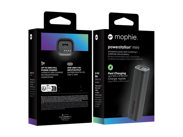 The mophie powerstation mini by ZAGG is a compact power bank designed to keep cellular phones charged on the go. With a capacity of 5000 mAh, it provides power to ensure devices stay energized during daily activities or travels. The inclusion of a 20 W output means faster charging capabilities, allowing for efficient use of time. Additionally, the power bank features an LED indicator so users can monitor battery status, making it a practical accessory. Its built-in USB-C cable enhances portability, reducing the need for extra cables in a busy lifestyle.