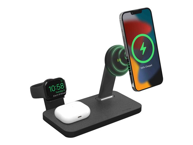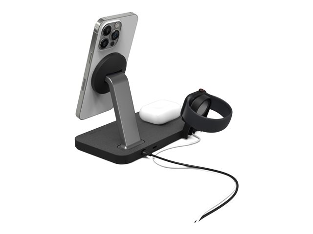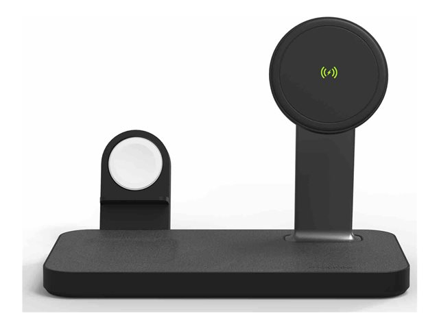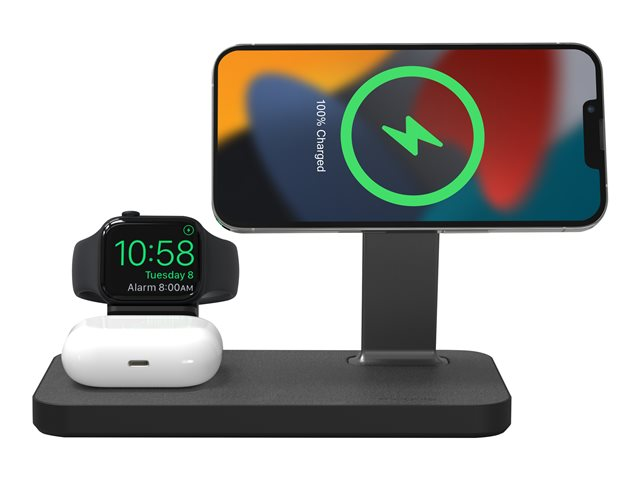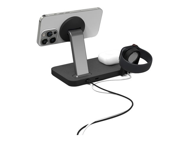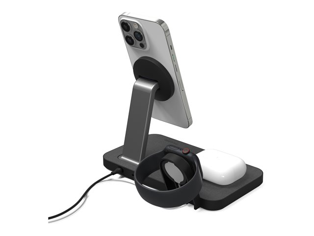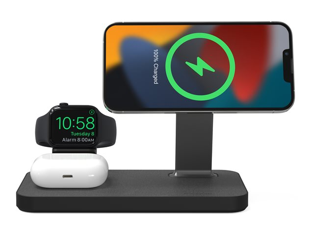 Lad alt. Alt på en gang. Snap+ 3-i-1 har en ladepute for trådløs telefon, en ladepute for trådløs hodetelefon og to klokkeadaptere som lar deg koble til Apple Watch eller Galaxy Smartwatch-laderen. Telefonstativet er MagSafe-kompatibelt og fungerer med ikke-magnetiske telefoner takket være snap-in-adapterringen. Få opptil 15 W strøm for Android-enheter eller opptil 7,5 W strøm for Apple-enheter.