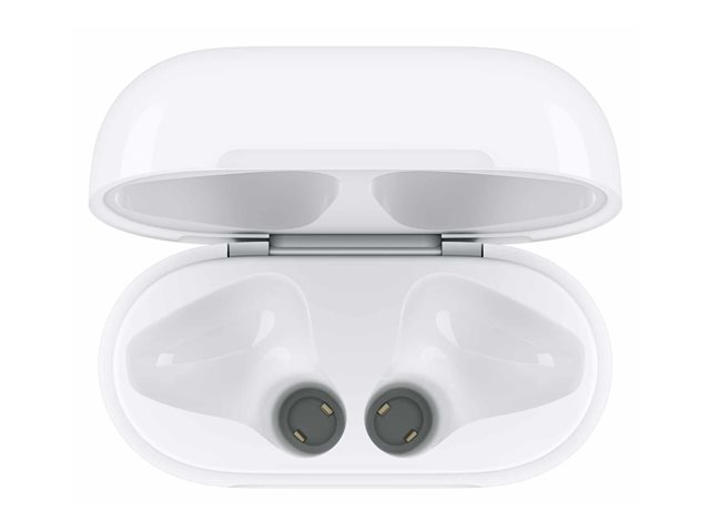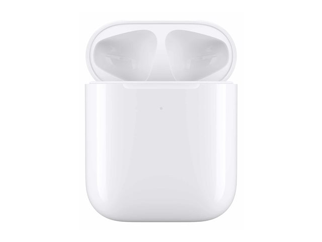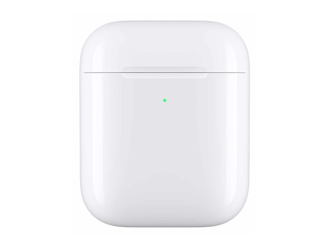 Det er enkelt å lade med det trådløse ladeetuiet. Du legger AirPods i etuiet, og legger etuiet på en kompatibel ladeplate. LED-lyset på fremsiden indikerer at AirPods lades. Og når du ikke har tilgang til en ladeplate, kan du bruke en Lightning-tilkobling til lading. Det trådløse ladeetuiet fungerer med alle generasjoner av AirPods og kan lade dem flere ganger.